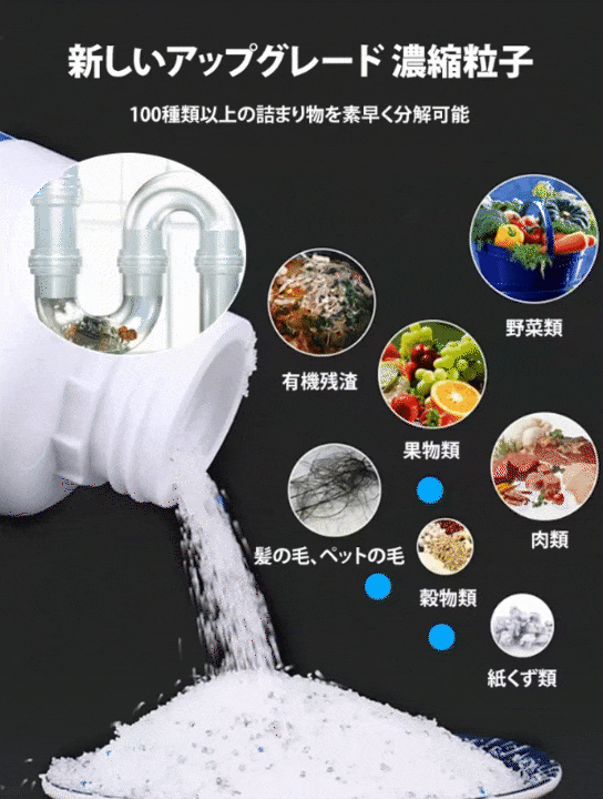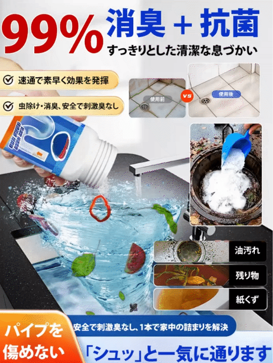 30秒でつまり解消、水たれ・悪臭・害虫もスッキリ。 粉末を流すだけ、工具不要・業者不要で誰でも簡単セルフ清掃。